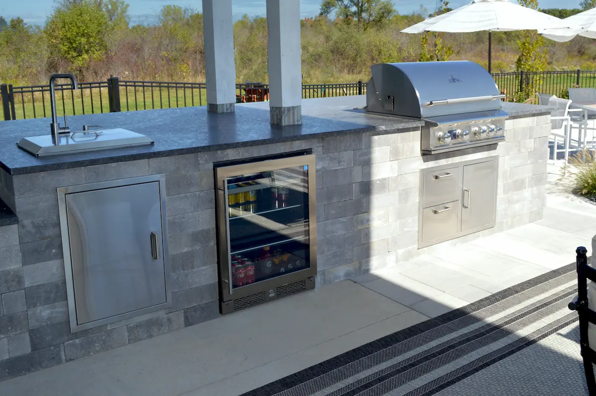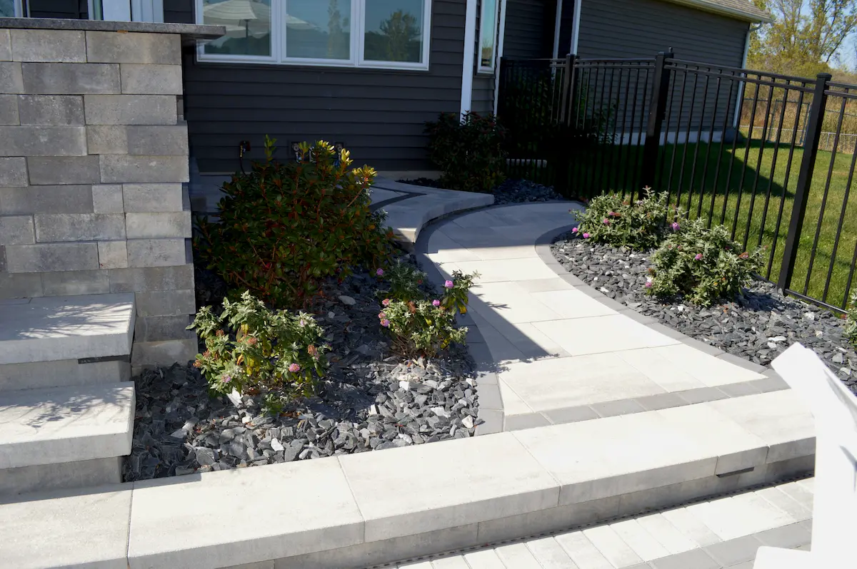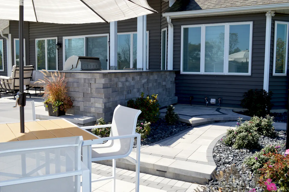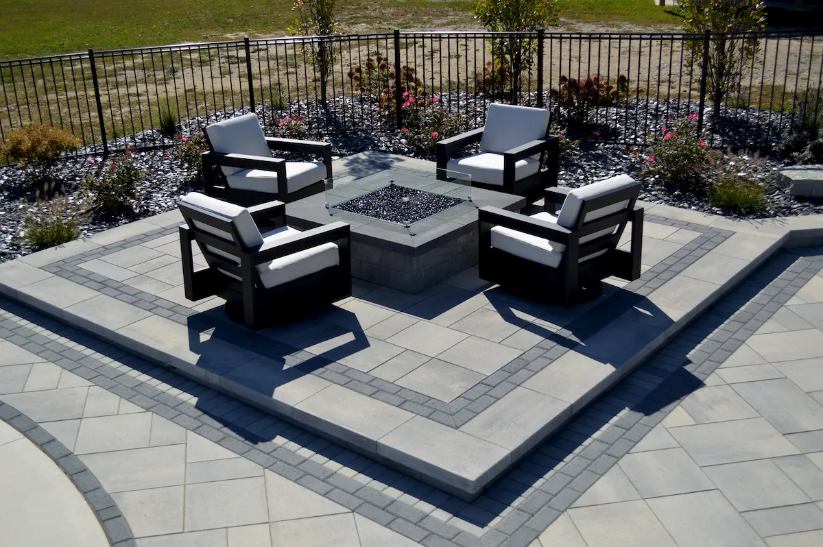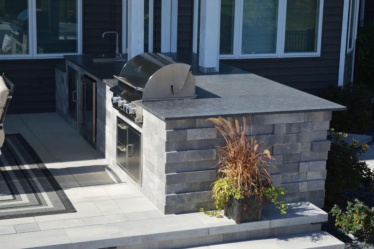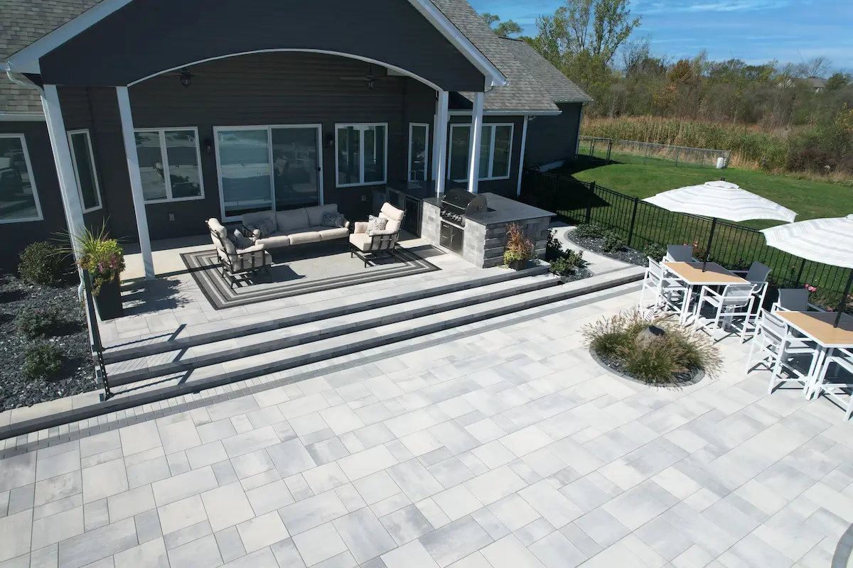 After exploring multiple design concepts and refinements, the final layout delivers a seamless open-concept space with plenty of room to gather and unwind. A spacious patio constructed with Oaks Nueva Slab pavers in Marble Grey is framed by rich Oaks Market Paver borders in Onyx, creating a clean yet striking contrast. The raised gas fire pit is thoughtfully positioned closer to the home, offering a cozy focal point that naturally draws people together. A large outdoor kitchen, built with Oaks Nueva 150 wall blocks in Marble Grey and finished with coordinating Nueva coping in Marble Grey and Onyx, anchors the space and provides everything needed for outdoor entertaining.
