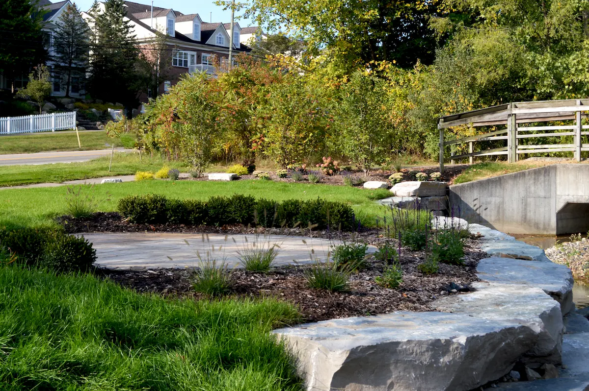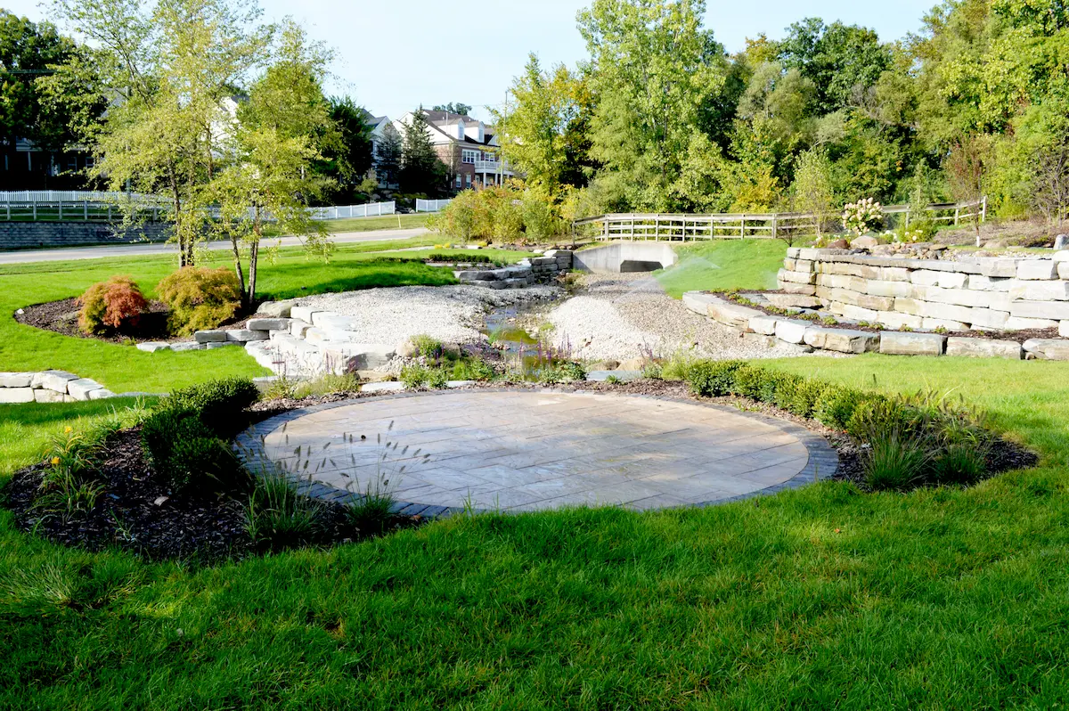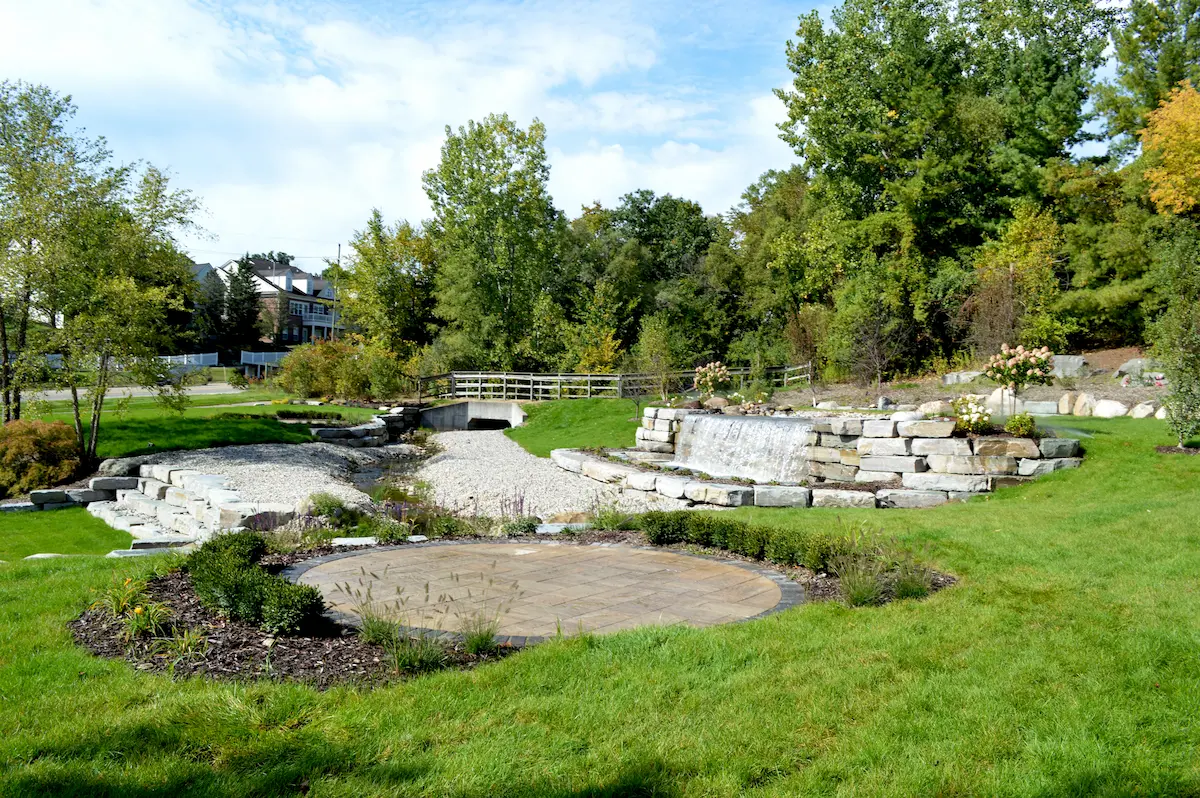 The finished design creates a calm, park-like setting that blends seamlessly with the waterfront environment. Lush landscaping beds were added throughout the space, softening the hard edges of the retaining wall and framing the water feature with layered textures and greenery. Thoughtfully placed plantings add depth, seasonal interest, and a sense of flow as guests move through the area. To encourage people to linger, intimate paver sitting areas were incorporated near the water, offering comfortable spots to relax and take in the views. The patios were constructed using Belgard Origins 6 pavers in Ashwood, providing a warm, natural tone that complements the landscape, while Belgard Brooklyn pavers in Midnight were used as a border to add crisp contrast and visual definition.