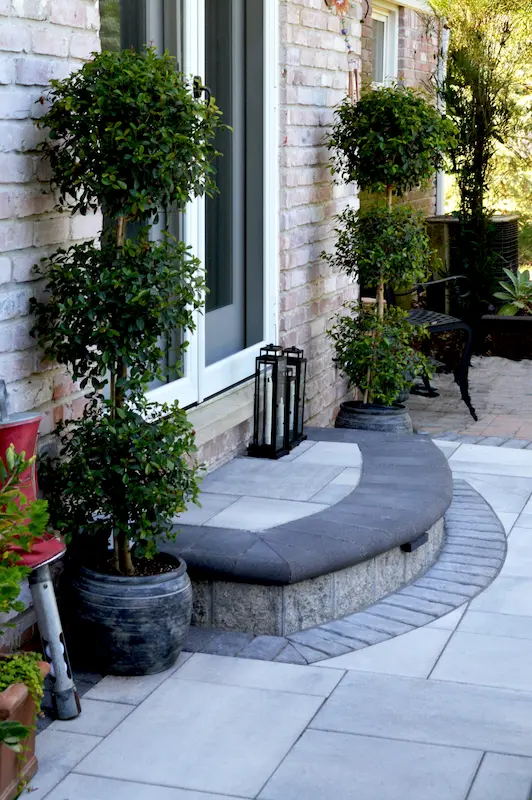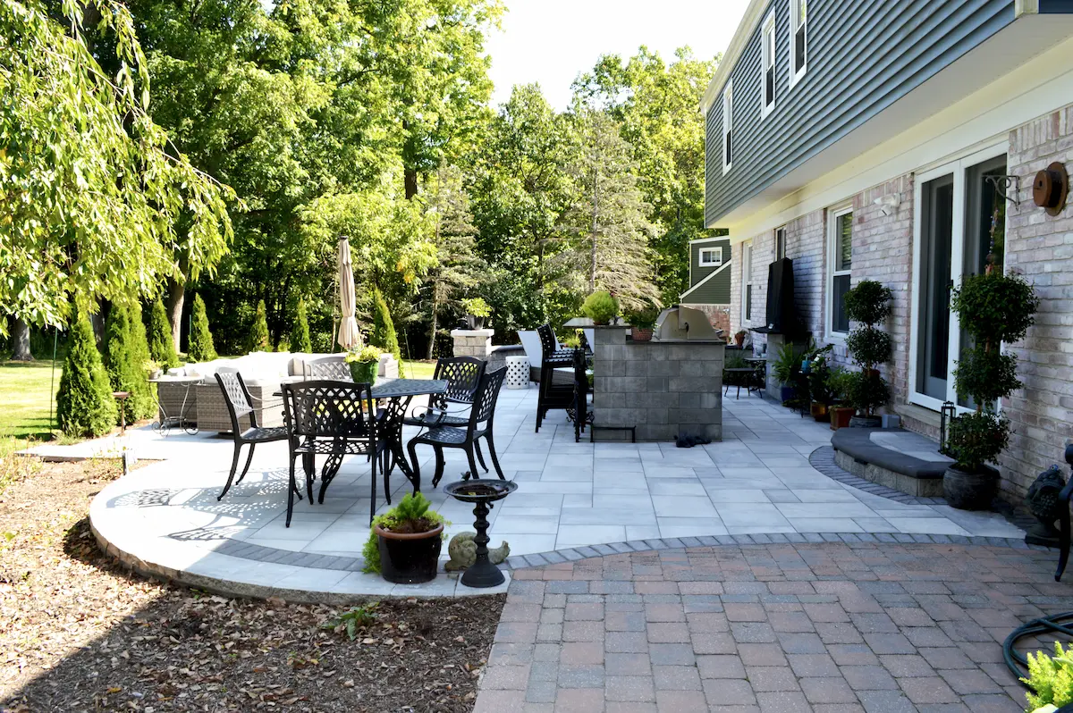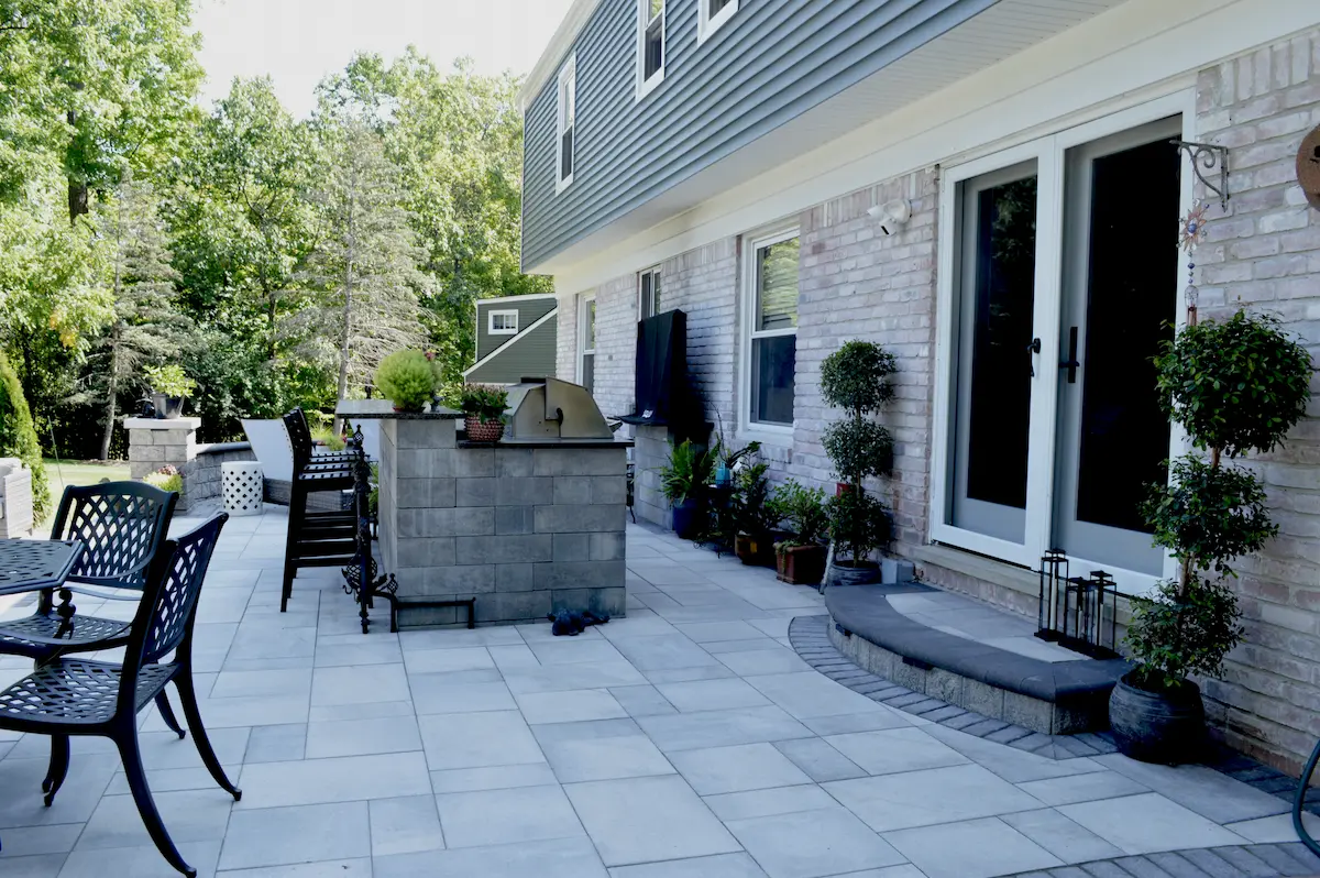 The final design delivers a beautifully layered outdoor environment filled with texture, flow, and purpose. At the heart of the space is a stunning tiered paver patio constructed with Oaks Nueva Slab pavers in a sleek Marble Grey tone, framed by a bold Belgard Brooklyn Midnight border for contrast. The multi-level layout creates natural gathering zones, including an inviting lower fire pit area and an elevated grill and bar space built with Oaks Nueva 150 wall blocks, complete with a raised bar-top seating area ideal for entertaining.