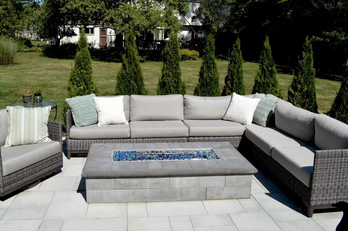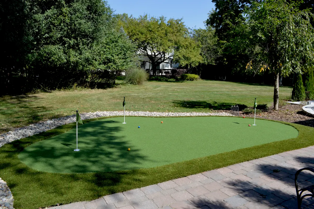 The outdoor kitchen is both stylish and practical, while Oaks Ortana walls in matching Marble Grey define the patio with a cohesive, modern finish. A custom gas fire pit adds warmth and ambiance, while thoughtfully placed outdoor lighting highlights architectural details and extends usability into the evening hours. The addition of a putting green and lush landscaping around the patio in the following year completed the space, enhancing both beauty and playfulness.